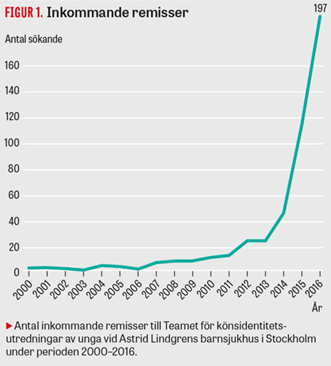 Sweden’s Astrid Lindgren’s Children’s Hospital, incoming referrals regarding gender dysphoria increased significantly (65X) from 2000 to 2016: