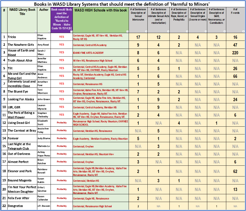 For more info on how to challenge a “Harmful to Minors” book, you may wish to contact WASD’s Library Coordinator: Dennis Hahs, hahs.dennis@westada.org